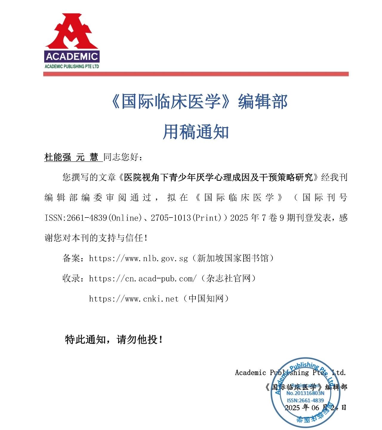近期,成都棕南医院精神卫生中心研究团队主要成员杜能强、元慧医生合作撰写的学术论文《医院视角下青少年厌学心理成因及干预策略研究》在《国际临床医学》(国际刊号ISSN:2661-4839(0nline)、2705-1013(Print))正式发表,充分彰显了我院在青少年心理临床研究领域的深厚积淀与创新实力。