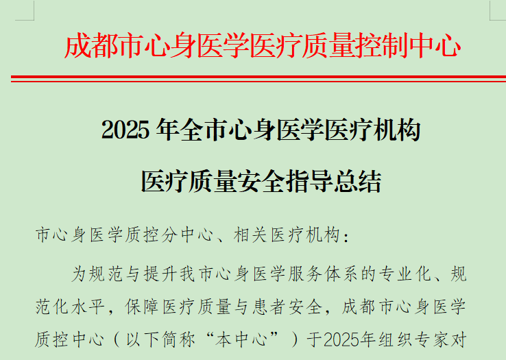 为进一步提升我院心身医学医疗质量,聚焦心身医学服务核心要素,充分评估我院相关学科建设与资源配置、人员资质与结构、患者安全与就医体验等关键工作成效,成都市心身医学医疗质量控制中心专家组一行于11月对我院进行了专项质量安全指导。12月17日,中心发布《2025年全市心身医学医疗机构医疗质量安全指导总结》(以下简称“总结”),我院相关工作获得积极好评。